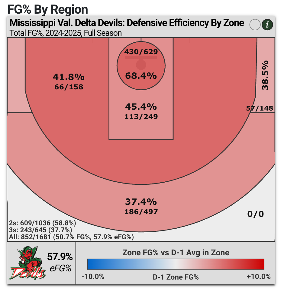 The point of defense is to make your opponents take bad shots, but MVSU had essentially no control over shot selection, its defense serving as a funnel to the paint. 37.4% of its opponents’ field goal attempts came at the rim (a really bad number), and they converted those attempts at a 68.4% rate (an even worse number). Just 9.4% of opposing shot attempts came from the midrange.