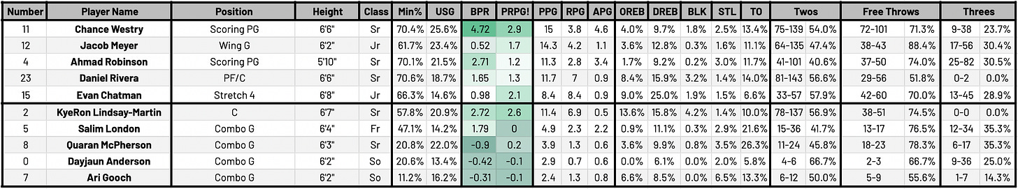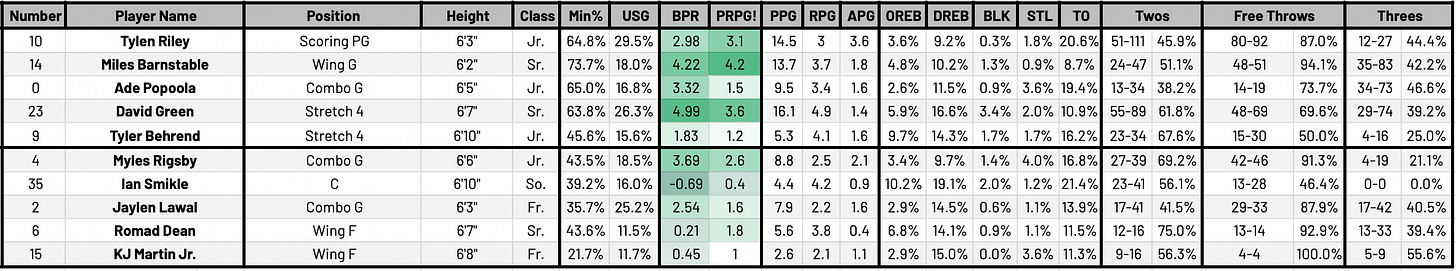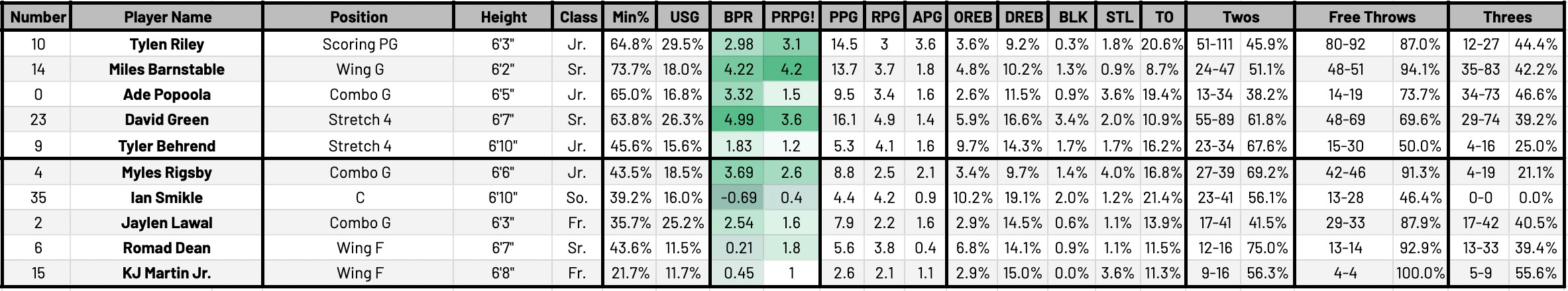 Beside Riley in the backcourt is guard Miles Barnstable (13.7 PPG, 1.8 APG), a hyper-efficient catch-and-shoot threat who has made 42.2% of his triples and 94.1% (!!!) of his free throws on the year. Barnstable primarily lives behind the arc, but he’s also capable of attacking the rim and kicking it out to shooters. His KenPom player comparison, coincidentally, is a supercharged version of Tony Toney.