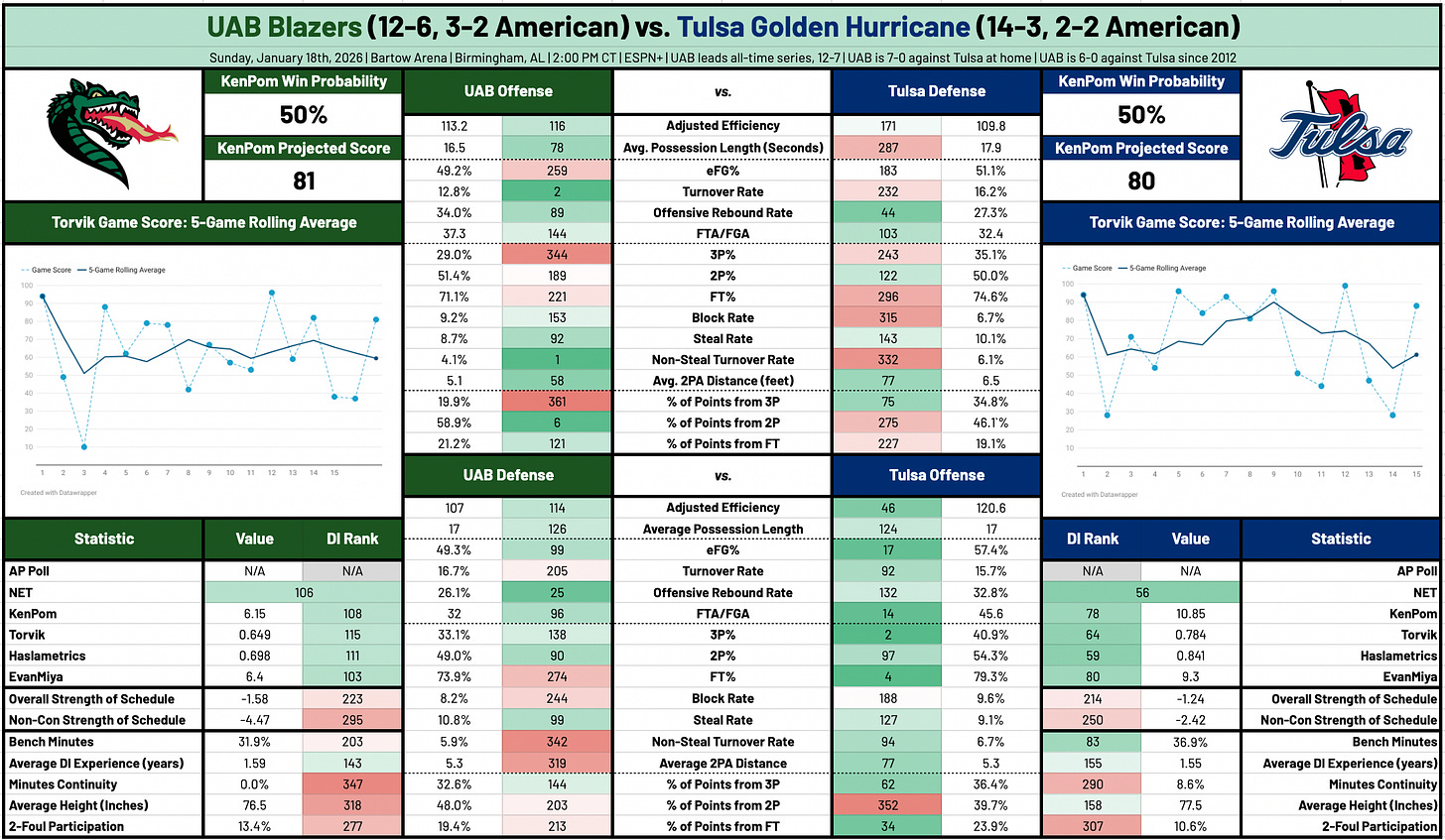 South Florida beat Tulsa thanks to ten (!) triples from old friend Wes Enis, while North Texas, one of the few American teams that might be worse at shooting than UAB, knocked off the Golden Hurricane on the back of an eight-of-18 (44.4%) performance from beyond the arc. The Blazers can put themselves in a position to win by limiting turnovers, grabbing offensive rebounds, and feeding their big men down low, but this one, as previously stated, might come down to jump-shooting variance.