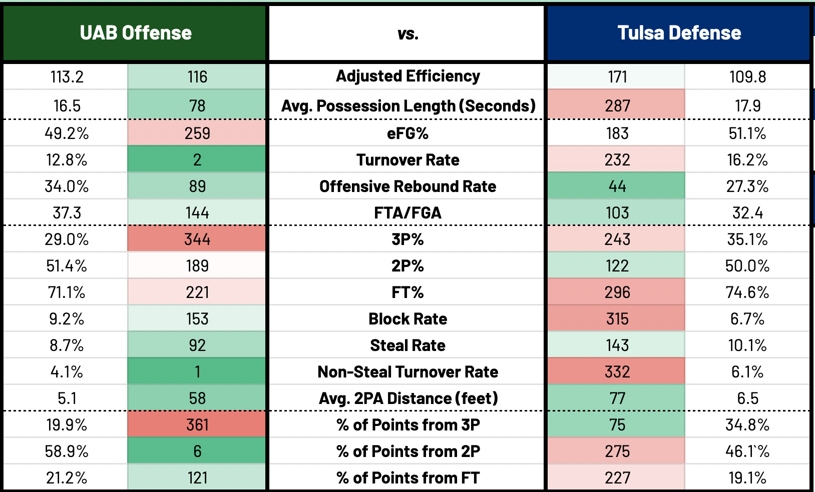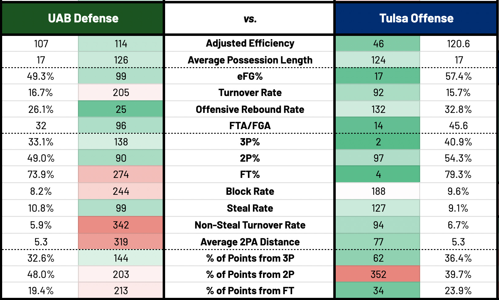 That’s not to mention offensive rebounding — Golden Hurricane opponents scored a whopping 18.9% of their points on second-chance opportunities. You may recall UAB’s aforementioned 83-51 beatdown of Tulsa, during which the Blazers shot 70% at the rim while posting 17 second-chance points.
