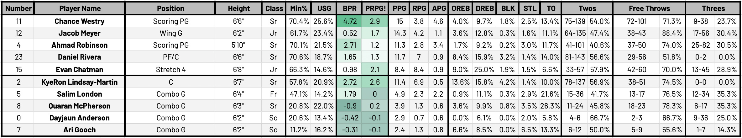Wing Ade Popoola (9.5 PPG, 3.4 RPG), who we’ll talk about more later, is another perimeter-oriented guy you don’t want taking triples — he’s making 46.6% of them — although he struggles a little bit with turnovers. Fellow wing Myles Rigsby (8.8 PPG, 2.1 APG), who comes off the bench, is the rare member of this team who can’t shoot; however, he makes up for it with passing chops and impressive numbers as a cutter and a rim attacker.