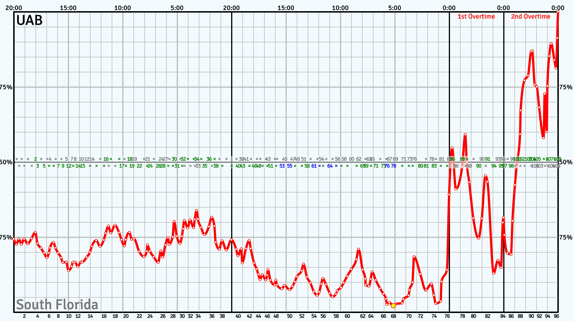 McPherson one-upped himself about 32 minutes of game time later, when the Blazers’ win probability had dropped to just 12.9% at the end of the first overtime. Down 94-91 with 40 seconds on the clock, UAB needed a bucket, but Meyer came up short on a three-pointer; however, in one of its many late-game miscues, South Florida knocked the rebound out of bounds and allowed the Blazers to try again. In perhaps the most important moment of his young UAB career, Salim London drove around Pinion and converted a difficult layup over Nelson, cutting the Bulls’ lead to one. USF’s Isaiah Jones split a critical pair of free throws on the other end, and with less than 15 seconds remaining, UAB had a chance to stay alive.
